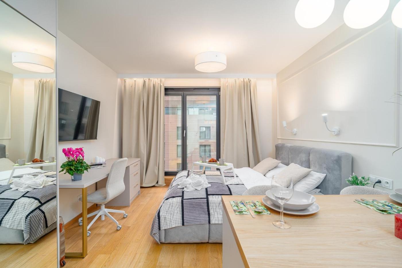 Apartament typu Classic. Featuring a private entrance, this air-conditioned apartment comprises 1 living room, 1 separate bedroom and 1 bathroom with a shower and a hairdryer. Meals can be prepared in the well-fitted kitchen, which comes with a stovetop, a refrigerator, kitchenware and an oven. Boasting a terrace with city views, this apartment also provides a tea and coffee maker and a flat-screen TV with streaming services. The unit offers 2 beds. Apartament - 4 osobowy. Powierzchnia pokoju ok.: 33 mkw. ;
