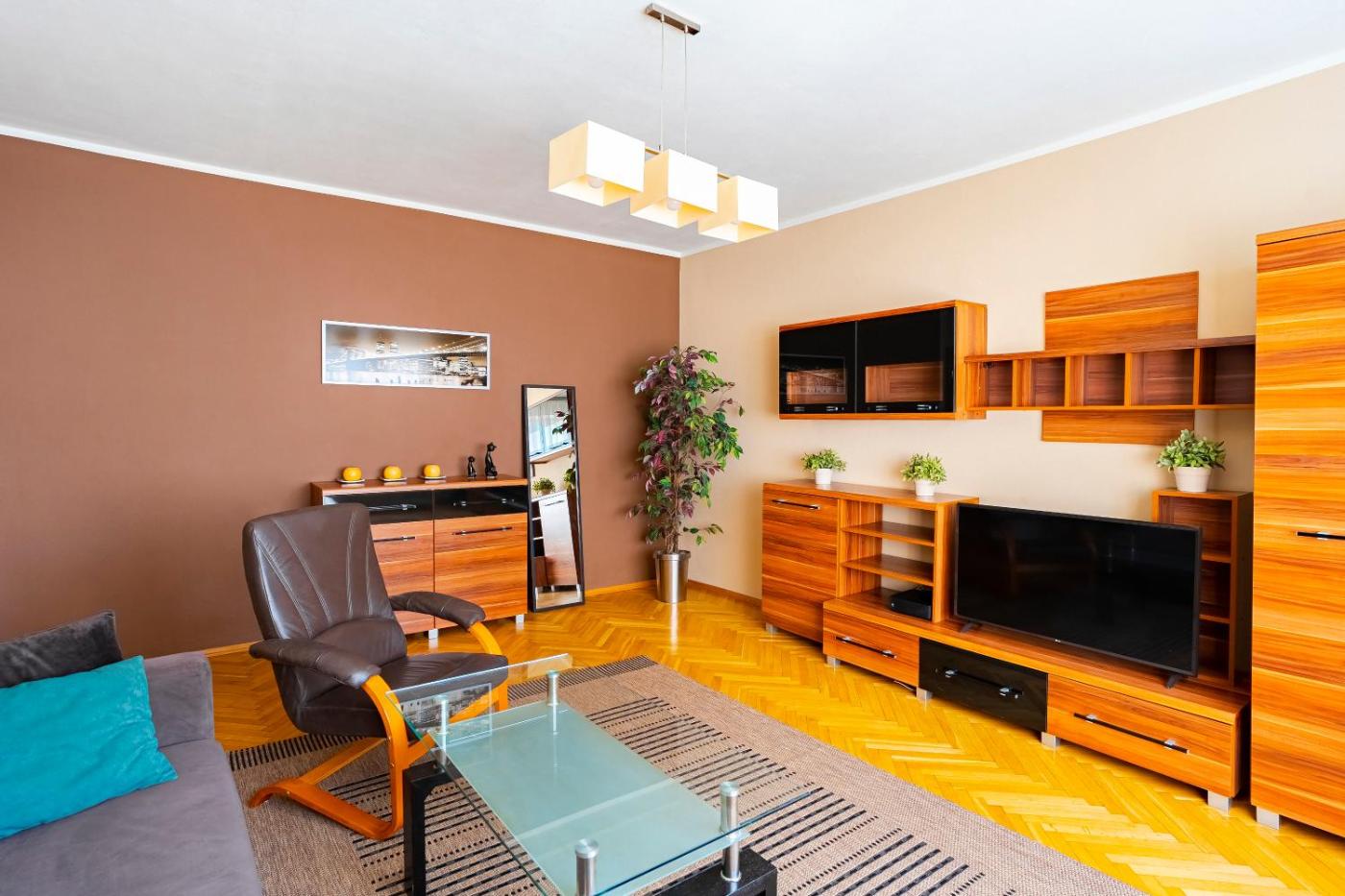 Apartament z 1 sypialnią. Boasting a private entrance, this apartment features 1 living room, 1 separate bedroom and 1 bathroom with a shower and a hairdryer. The well-equipped kitchen has a stovetop, a refrigerator, kitchenware and an oven. Featuring a balcony, this apartment also features a washing machine, an electric kettle and a flat-screen TV. The unit has 2 beds. Apartament - 4 osobowy. Powierzchnia pokoju ok.: 38 mkw.